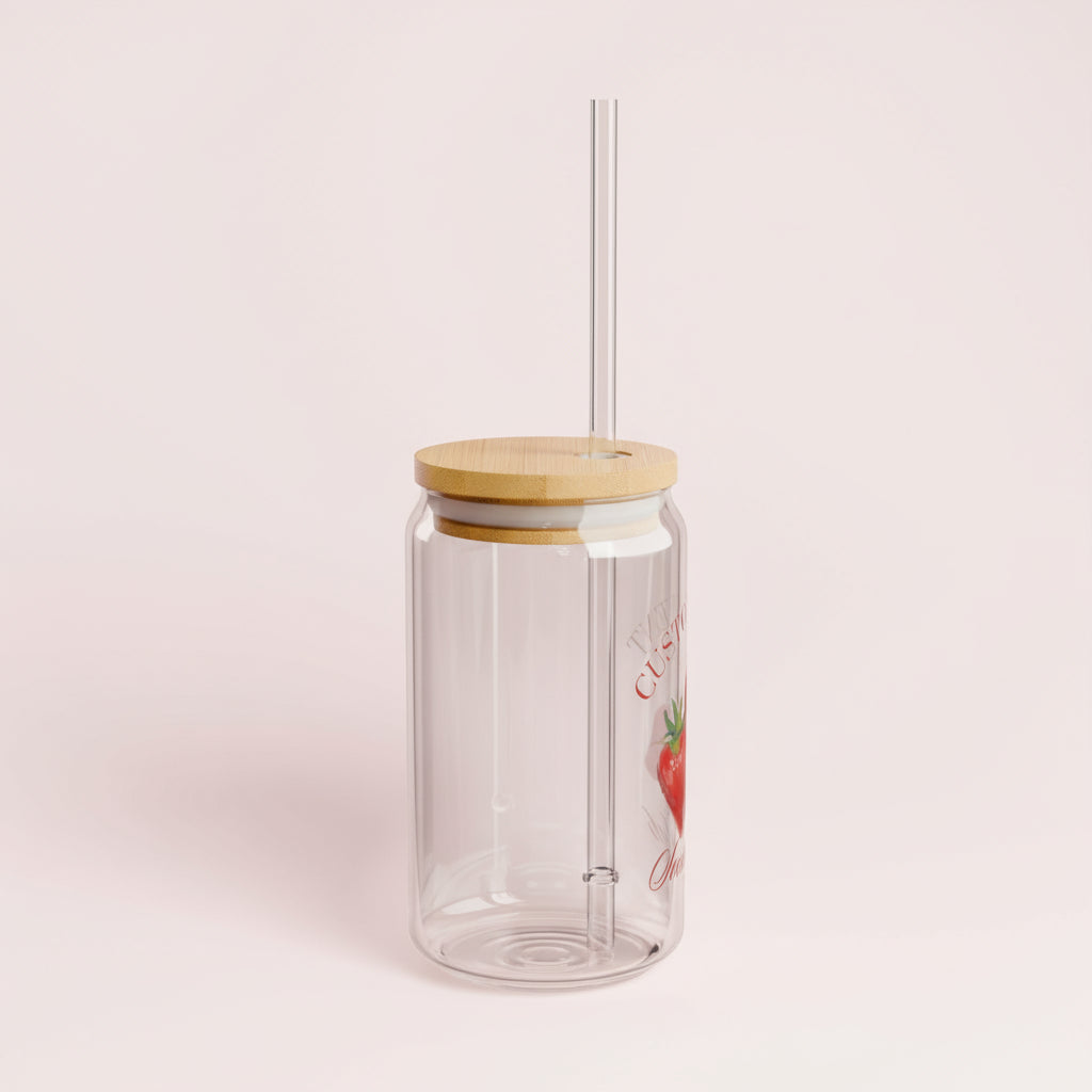 A vibrant and customizable sipper glass featuring a strawberry design with the option to add a custom name for city events, gifts, and holidays. Perfect for those who enjoy refreshing beverages in style and want to add a personal touch to their drinkware. Ideal for summer parties, picnics, and gift-giving occasions.